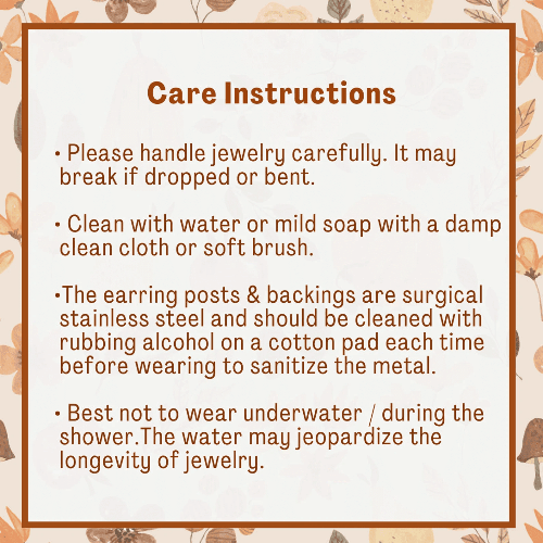 • The earring posts should be cleaned with rubbing alcohol on a cotton pad each time before wearing to sanitize the metal.